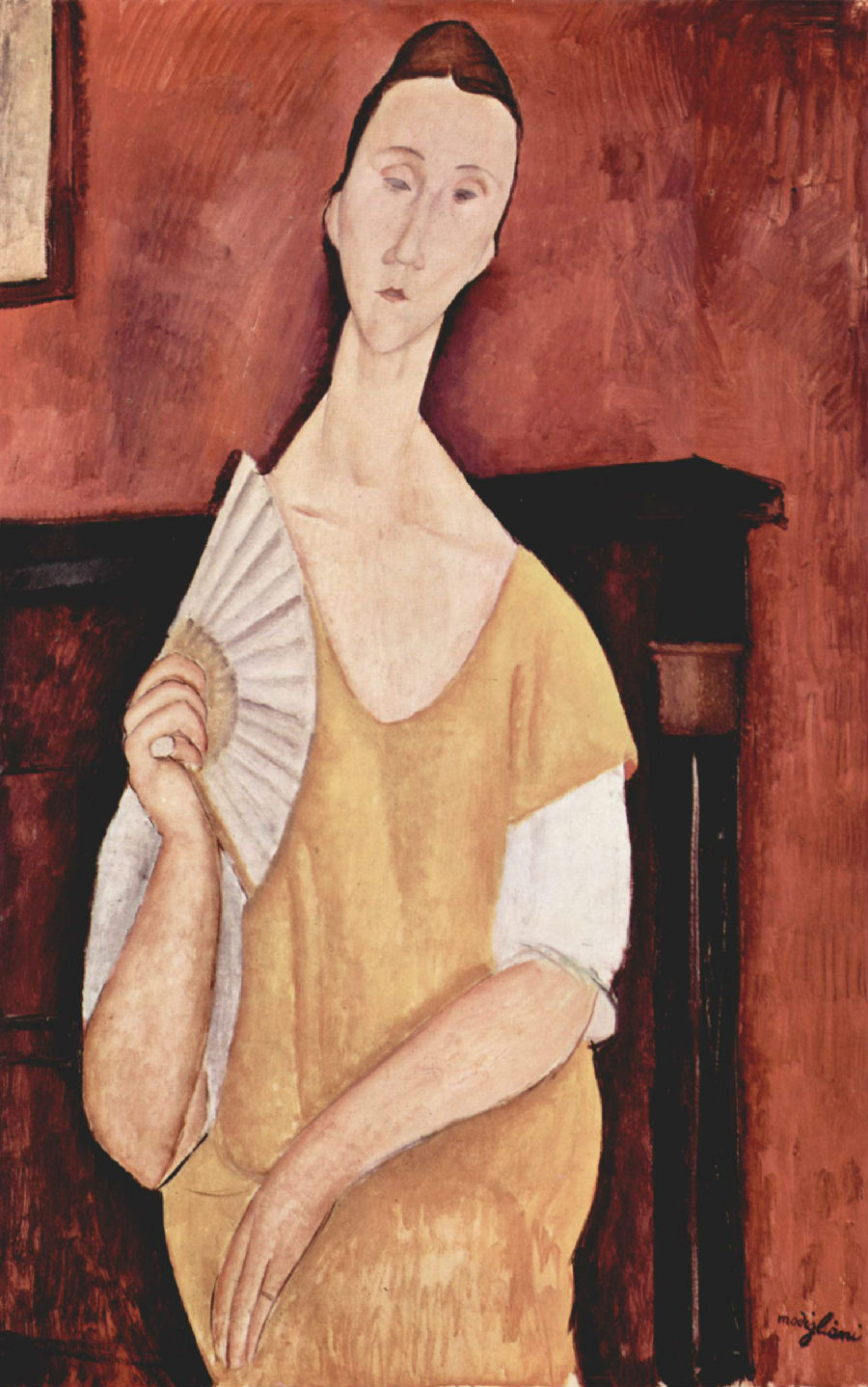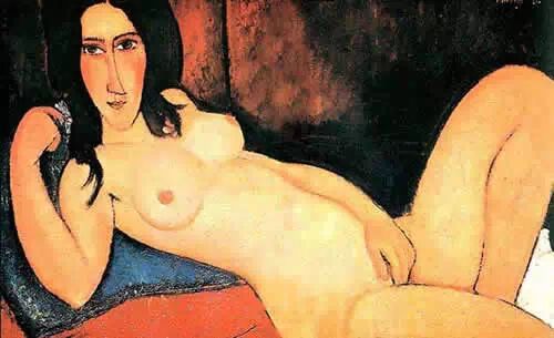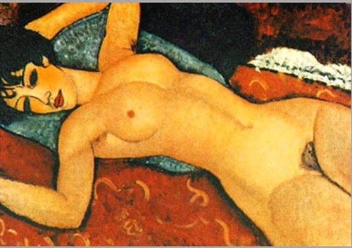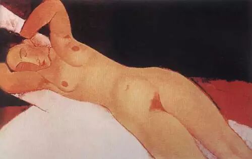 除了这些优雅的肖像作品之外,说到莫氏的作品就不能不谈到他的人体油画。从1917年到1919年间,他连续创作了许多女性人体画。这些人体作品基本上是采用细线勾勒与色彩平涂的手法,与他的肖像画作品有着明显的不同,同时也区别于其他著名的人体作品,只要一眼看去就知道这是莫迪里阿尼的人体。画面充满了张力,无论是《横卧的裸妇》还是著名的《白色坐垫的裸妇》,一股让人窒息的美扑面而来,那些暖艳修长的裸体,迷离慵倦的意态,画面紧凑的组织与严密又放任的动态,天衣无缝地结合在一起,几乎能让人触摸到肌肤的香暖与柔软。画作虽然都以明亮的暖橙色为主调,却依然让人感受到一种难以言说的哀伤,并因那奢华的暖艳愈显悲哀。可惜的是,在当时这些美丽的画作,不但没有为画家带来声望与尊重,反而招致一场耻辱。由于开幕当天,一大群观众聚集在画廊的橱窗前看一张女性裸体画作,引起了警察的注意,竟以有伤风化为理由,强令画展撤下这幅画作及其他人体画作。莫氏艺术生涯中唯一一次个人画展遂以这样的结局而告终,不得不说是一种历史的无知与悲哀。