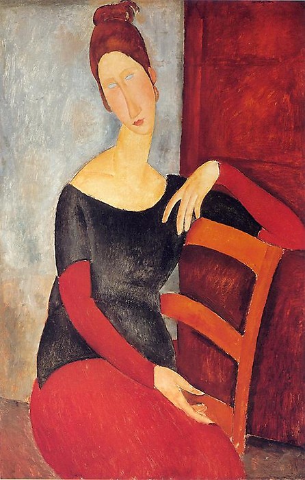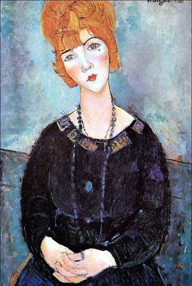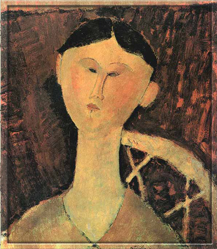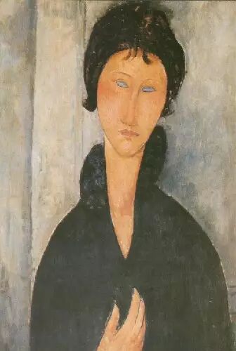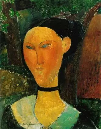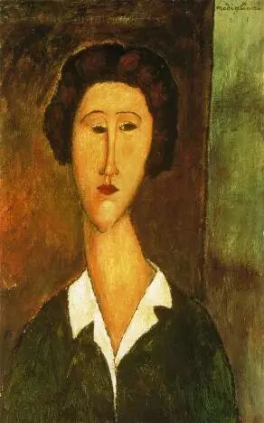 他是一个真正的独行者,游离于所有的艺术流派之外,他完全属于他自己。曾有一次,当时走红的未来主义画家们要发表一份宣言,组织者想请莫迪里阿尼在宣言上签名,以示支持,不料他一口拒绝。他曾经说过,他笔下的人物,看的是自己的内心世界。所有他笔下的人物,像画家本人一样孤独,或双目紧闭,即使画了双眼,人物的眼神也茫然空洞,没有焦点,他们对外部世界视而不见,眼眶只是空茫的蓝色,似乎有着一种刻骨的厌倦和绝望。卡罗·曼曾形容,那些眼睛“一只明一只晦”,“一只向内审视自我,另一只茫然向外”。这眼睛与卵形的脸孔,拉长的脖颈,纤细的鼻子形成了他特有的绘画符号。以装饰的手法运用流畅缓和的曲线,表现那些优雅而带着伤感的人像。