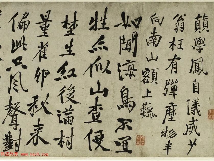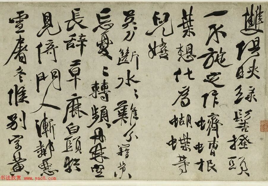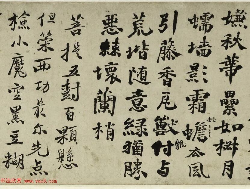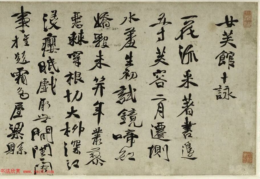 此卷行书,是徐渭自书七律诗十首,卷末题有“右咏,一为芙蓉、次芭蕉、玉簪、暖萱、藜、鸡冠、山楂、野葡萄、土菩提”,脱第二首咏《菊》一题。书体真行相间,运笔老辣凝重,点画明快,遣笔从容,推为中年之作。