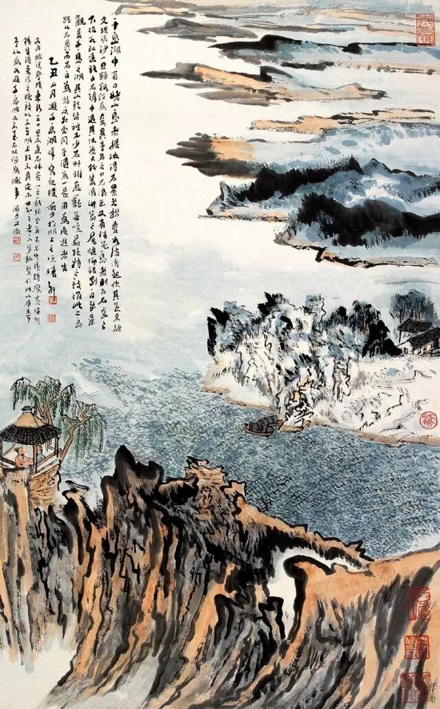 其实他大幅章法很窘,未能达到左右逢源的境界。用笔生拙奇秀,是他所长,信笔不经意病笔太多,是其所短。设色有出新处,用笔用墨变化很多,也是他的长处。知所短长,则何尝不可学。