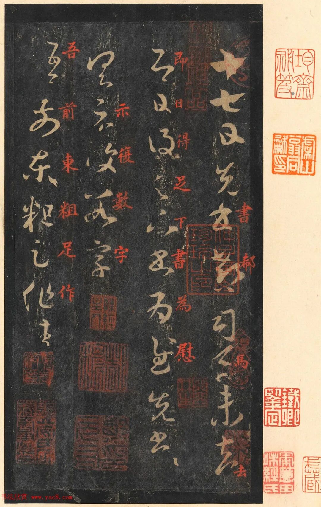 属于“馆本”系统中的“缺十七行本”,为罕见精品拓本。本拓本摹刻传神,字画清晰,墨色均匀,每幅作品章法完美,同时含有朱文释文,诚为“宋拓十七帖”诸版本中的佼佼者。