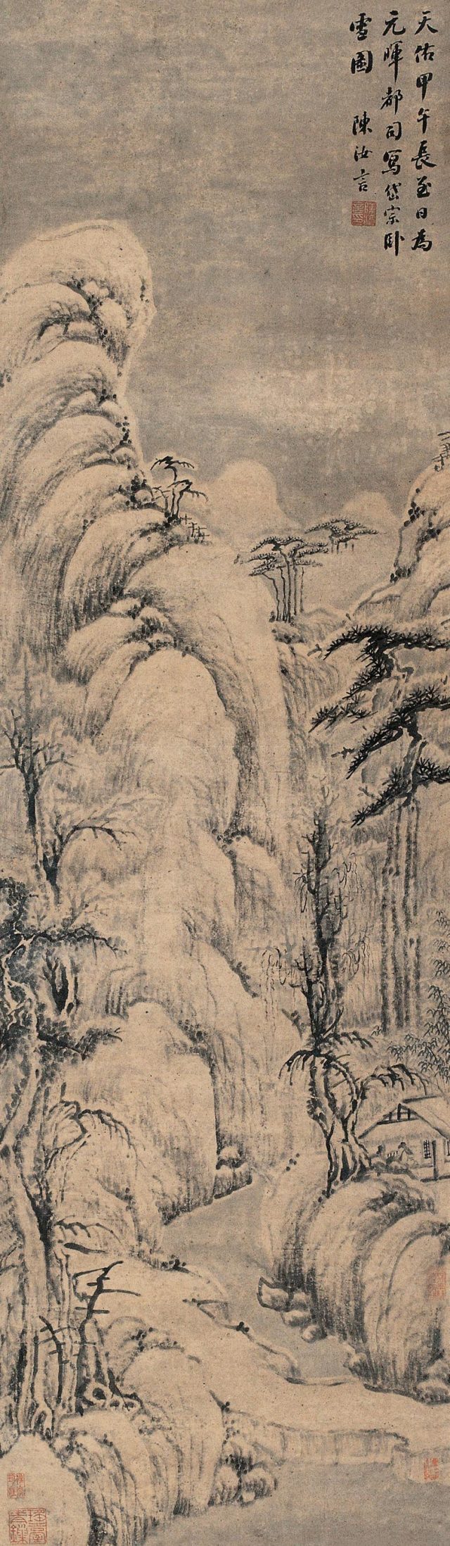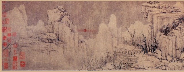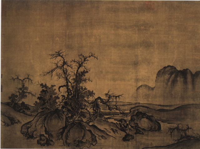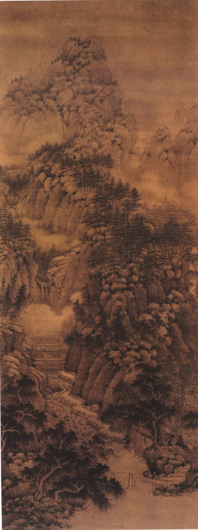 山水画的构图法,在长时间的实践中形成了“三远法”,即郭熙所谓的平远,自近山而望远山而谓之,如郭熙的《窠石平远图轴》;高远,自山下而仰山巅谓之,如荆浩的《匡庐图轴》;深远,自山前而窥山后谓之,如巨然的《万壑松风图轴》。高远之色清明,深远之色重晦,平远之色有明有晦。