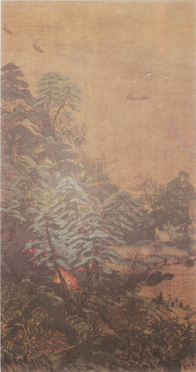 可见山水画的设色是很慎重的,好的设色能更好地体现画面效果,但更多的还是在墨色上来体现。当代画家赵春秋在创作雪景山水中,常以红色的春联灯笼、红衣人物作点景之物,冷暖对比鲜明,点点红暖烘托画幅白雪皑皑冬景的清寒萧瑟,可谓匠心独运。
