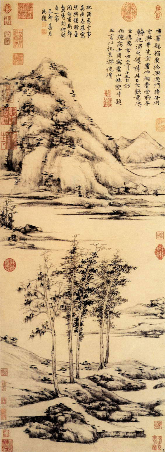 落款的形式多种多样,也是画面的一个重要组成部分,既可以抒发情感,又可以增加山水画的形式美感。印章也和题跋一样是书画不可或缺的一部分,好的印章能为画面添色不少。