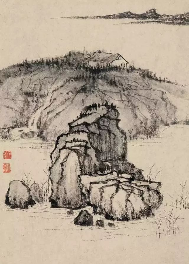 皴纹不足擦笔添,增加厚重粗糙感。擦笔要干轻触纸,不可破坏纹理线。由轻而重莫过分,一遍不足可数遍。山石质地有不同,皴擦可以不增减。