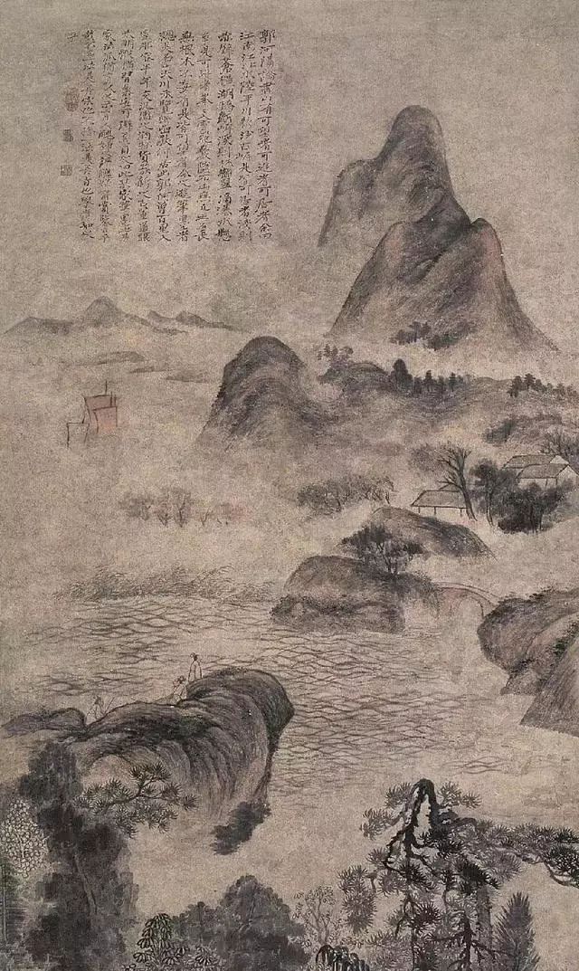 点皴皆需秃笔锋,反复积点淡到浓。追求浑厚和苍茫,前后层次要分明。切记不可皴过腻,虚实用笔要灵动。米点卧锋横用笔,茂林雾雨求朦胧。笔笔相接连成片,有浓有淡不板平。