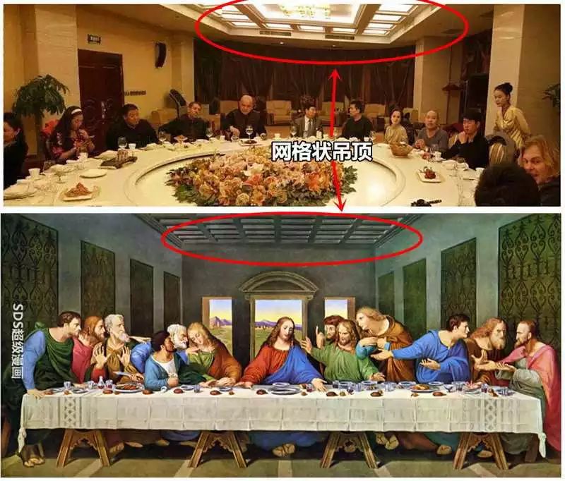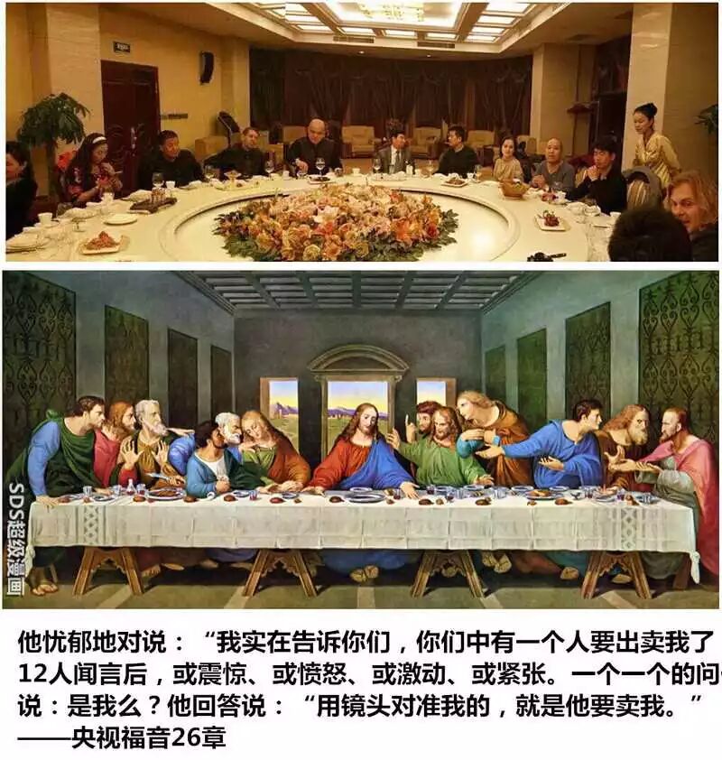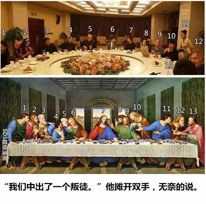 相似点四:“叛徒”座位均在画面左侧。“最后的晚餐”是左起第四,“姥爷的晚餐”是左起第三