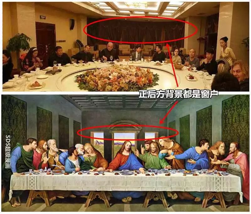 相似点六:正后方背景都是窗户。“最后的晚餐”是敞开的(白天),“姥爷的晚餐”则拉上了窗帘(夜晚)