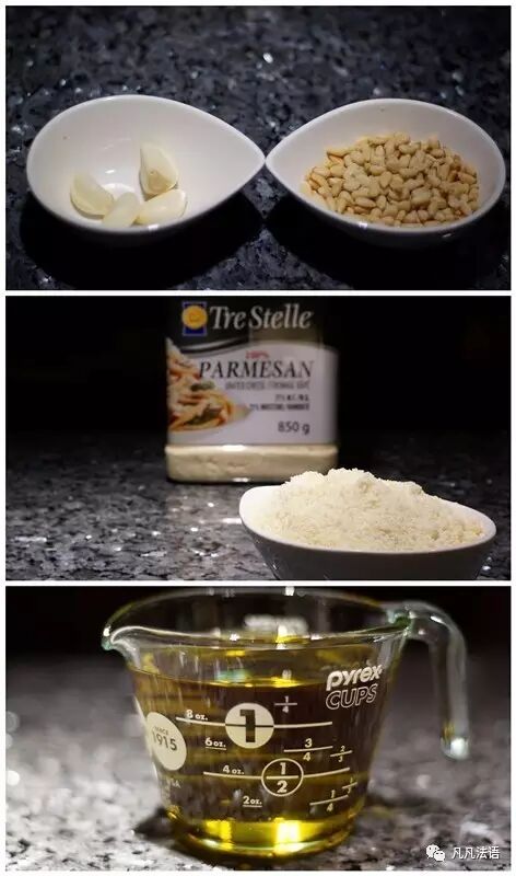 其次需要半杯(“杯”是一种计量单位,一杯相当于236.6毫升)烤熟的松子,一杯半上好的初榨橄榄油,以及我在(大树食经)中西火腿的美丽传说中提到的Parmesan cheese(帕玛森奶酪)一又四分之一杯,可以买一整块,自己刨成细末,也可以买现成已经碾成细末的Parmesan cheese,还需要四瓣大蒜。