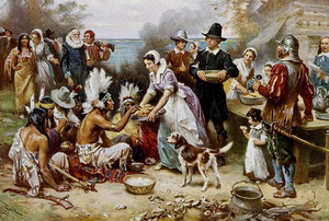 在庆祝丰收的那一天,马萨索德酋长带领了90名印第安人来到移民居住的普利茅斯村,和他们欢聚一堂。