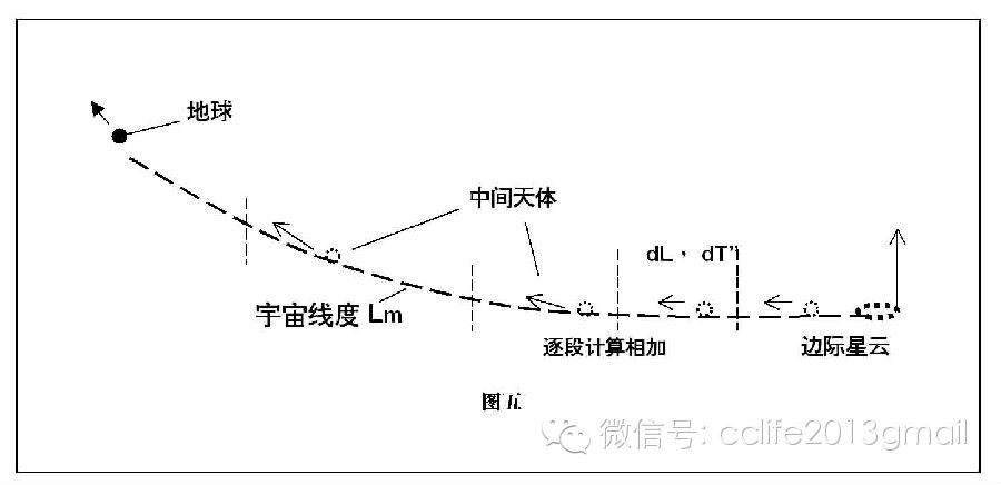 为此,先来确定从地球上观察宇宙的空时转化时间(T)。 但情况不同于简单的匀速运动。从地球对遥远宇宙边际的观察,是通过极长的中间宇宙地带进行的。而中间地带的时空是以不同速率膨胀著的。因此要确定地球对整个宇宙线度的观察,只能分区逐段进行。利用中间天体代替地球,对当地范围的空时转化进行观察,再累计起来得出总转化时间。具 地来作如下思考(图五):图 中的虚线表示现时宇宙线度(Lm)。想像该线度有如一条“宇宙铁轨”。始于边际星系,止于地球位置。中间众天体有如一系列“宇宙火车”,排队分路段(dL)按哈伯律定出的速度(V)从星系朝外开,一辆比一辆行驶得快,地球最快。