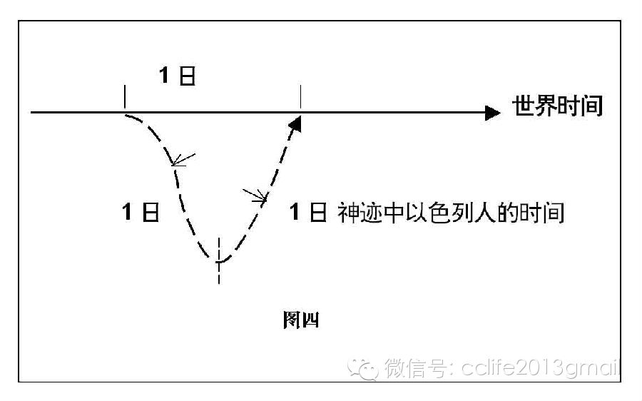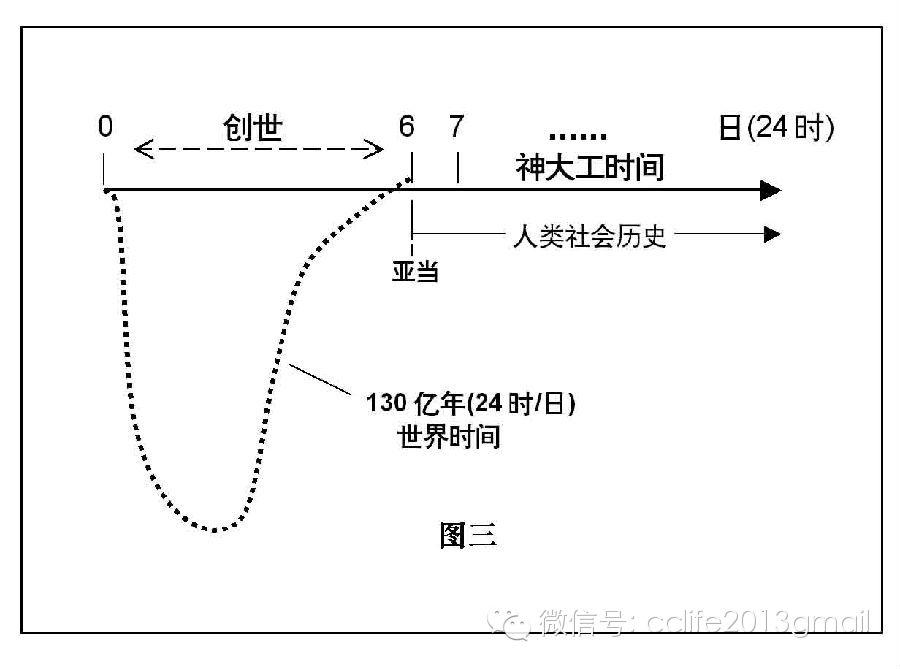 图三表示了两个时流的关系:水平实线代表神的时流。虚线代表世界时间。都对应创世过程。代表百亿年的线比代表7日的线长许多。故前者必须分离打弯后和后者首尾并结。此图表示,在创世中二时分离,各按自己的24小时1日度时。我们可以说世界时间“挤进”了创造时流,或者说世界时间从创造时流中“胀离出来”。创世后二归一。