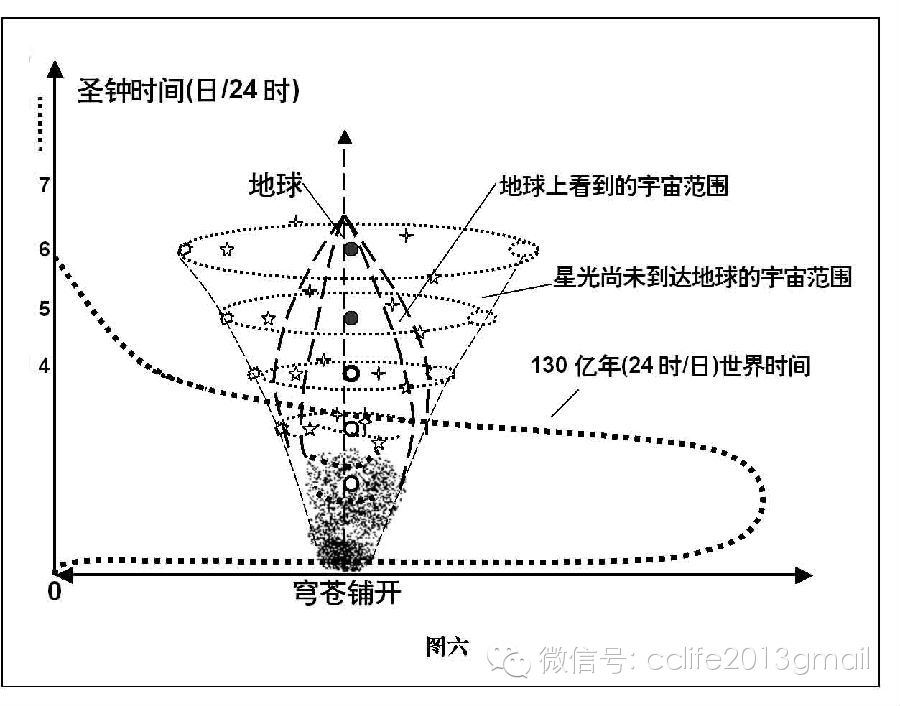 3. 回 到本文前节的圣钟时流。实际上圣钟是以光速奔向地球的。从地球上看到的星光,也都是指向地球的。星光从各个方向和圣钟相合奔向地球。而所有这些都是以光速或几乎完全是光速奔来。那么按圣钟参照系的同时性,前方的地球的时间永远比起后面的众星提早,且可无限制性的早。地球永远比光源星体要老许多,比日月众星 都老!这是从圣钟参照系看地球的必然结果!所以,从圣钟系统说第四日创造日月众星可以成立!