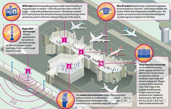 构成以色列机场安检系统的几大组成部分。包括电子标签芯片、立体三维热追踪红外照相机、 敌意检测设备、 痕迹侦测技术以及眼动反应装置。