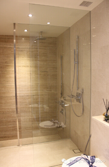 主卧洗手间最里面是花洒和深池,可以用来泡汤,中间是淋浴,外面是洗手池和马桶。