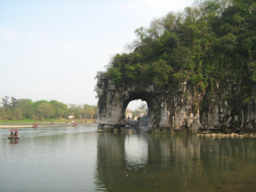 象鼻山 因山形酷似一头伸着鼻子汲饮漓水的巨象而得名,简称象山,长108米,宽100米,山体占地1.3万平方米。它神奇壮观、形神兼备,鼻脚之间造就的水月洞如同一轮临水皓月,构成“象山水月”奇景。象鼻山是桂林城的象征,桂林的城徽, 是桂林山水的代表。
