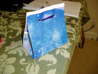 准备材料: 狗出漂亮的wallpaper images, 然后color print出来. 没有color printer的话, 买两张cardstock也可以. 实在不愿意买的话, 就找colorful的杂志页也可以.先看gift box, 如何制作在我的Blog里有参考video.再看gift bag -- 这个需要打洞的工具和一条ribbon