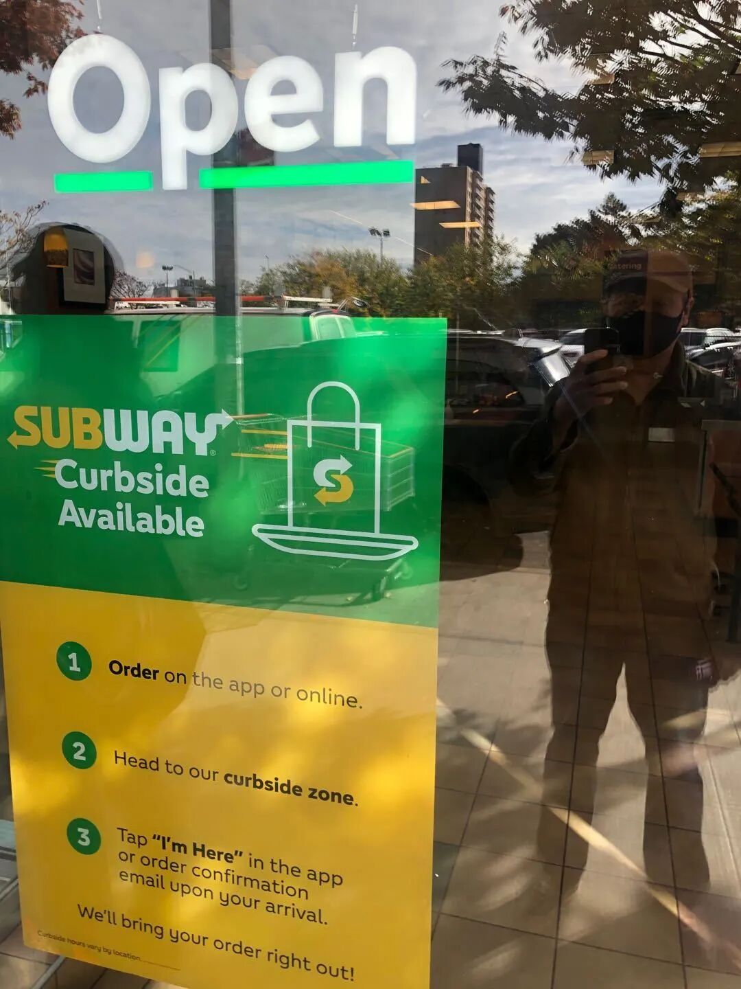 我排到Subway那家连锁店门口向里张望,店里面空空荡荡,餐桌椅都整齐的堆在墙边,唯有三三两两的,通过电话订餐后前来领取的人进进出出店铺。