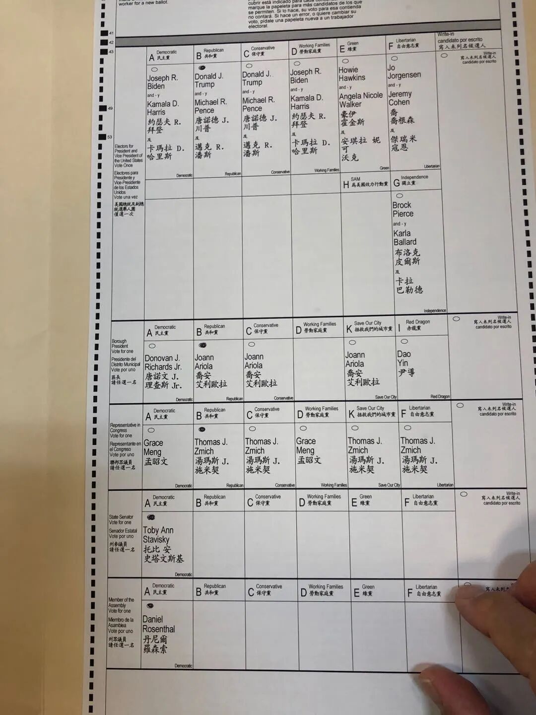 第一栏是总统和副总统候选人,有民主党、共和党、保守党、劳动家庭党、绿党和自由意志党,我在共和党川普那一栏填了实心圈。