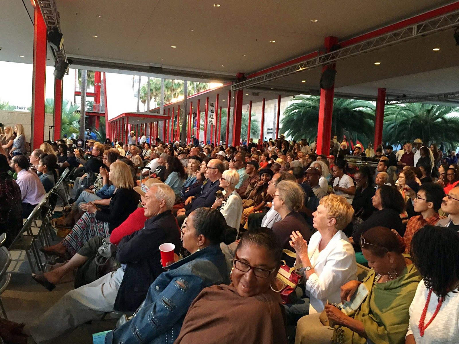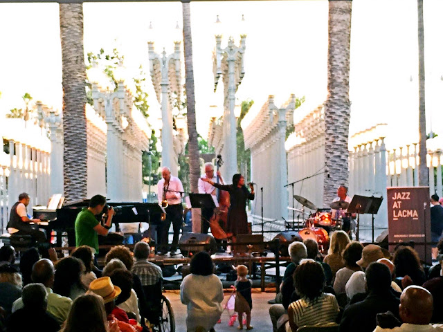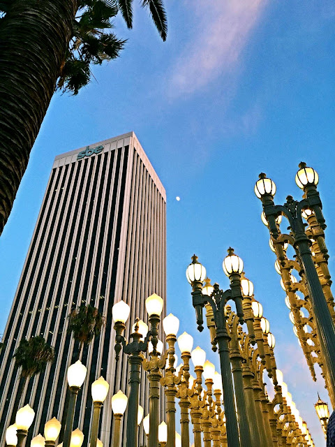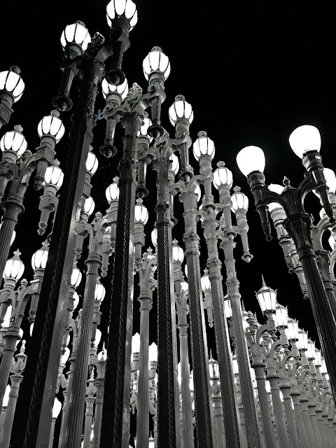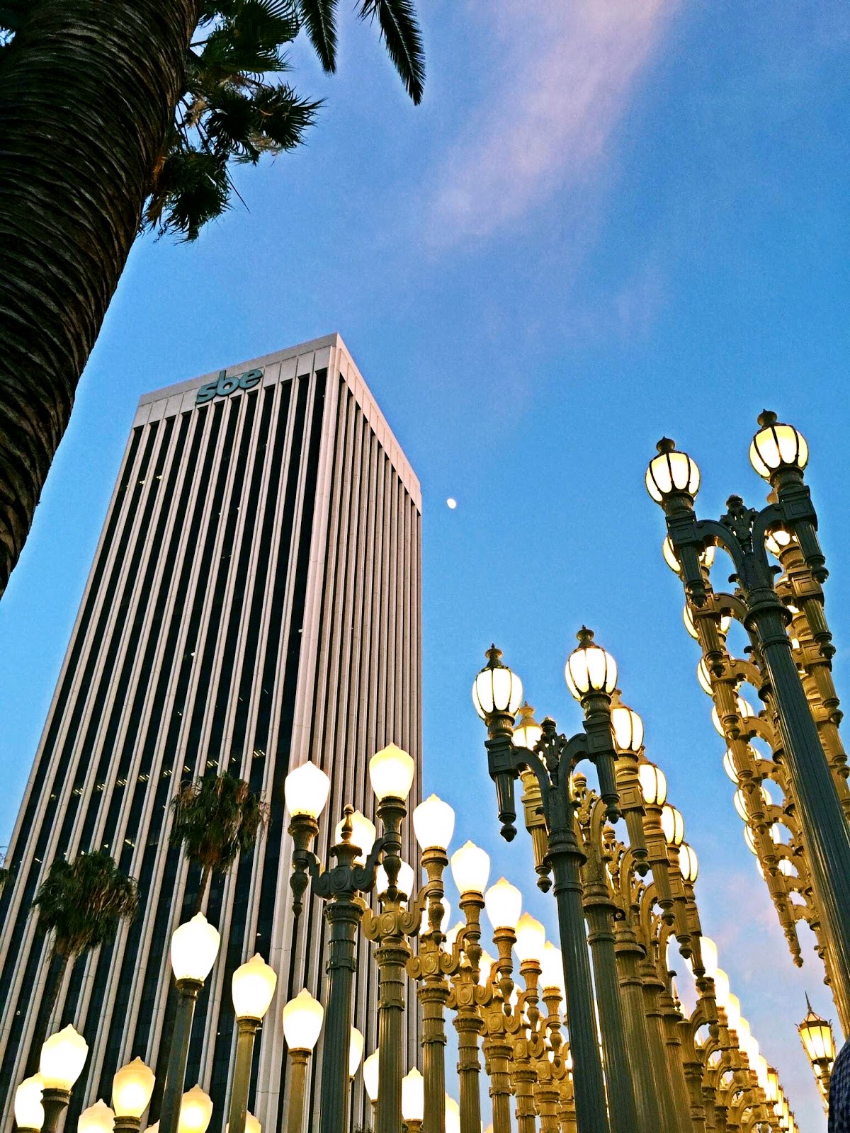 城市之光是克里斯·布登(Chris Burden)的大型组合雕塑,位于洛杉矶县艺术博物馆的Wilshire Boulevard大道入口处。 该装置由20世纪20年代和20世纪30年代的202台修复的路灯组成。女儿因为要到这里拍照,给某个杂志送相片,所以晚上我们就和闺蜜两口子分开,各自行动,反正中餐时下午4点多吃的,大家就各自活动了!我们去的时候正好是周末,有乐队现场表演,我们拍完照也就在酒吧找个位子,一边看着“城市之光”,一边听着音乐,喝着酒和自己爱的人悠哉享受当地人的生活!