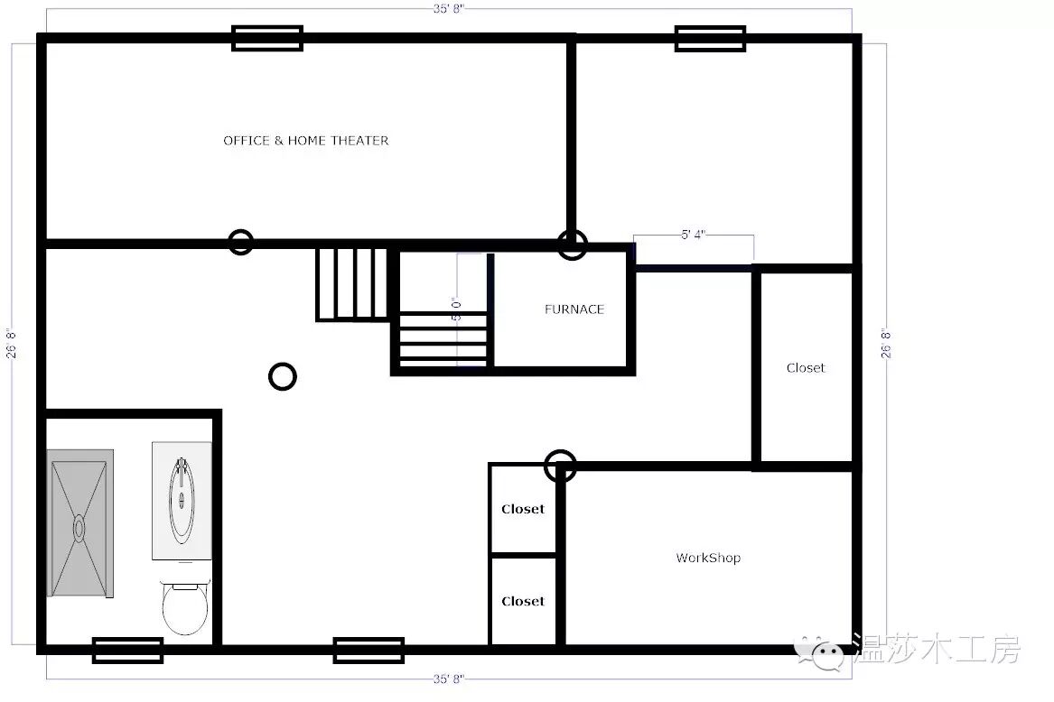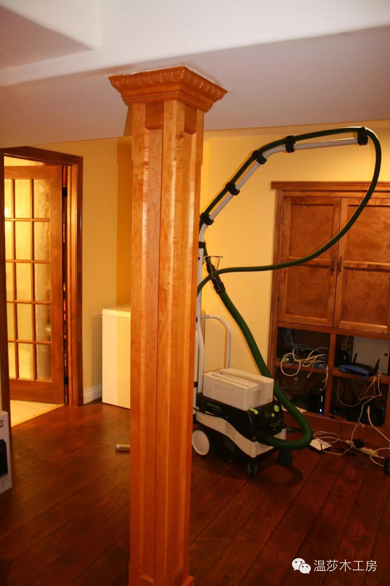 设计的第一步是画图纸,可以用autocad, sketchup 等,这些年做了不少东西,很感兴趣学习一下这些软件,可是终究没有找到时间。我采用的是最原始也是最简单方法 - 手画,手画的时候要注意比例,还要注明尺寸。计算材料时将会需要这些尺寸进行计算。还有楼梯,承重柱,锅炉, 洗澡间的预留管道都要注明。承重柱最好包在墙里面,如果设计不允许,可以包在装饰柱里 (Home Depot / LOWES 都有卖的),我是自己用做build-in家具的边角下料做的装饰柱。锅炉前面要预留32英寸以便于将来维护。