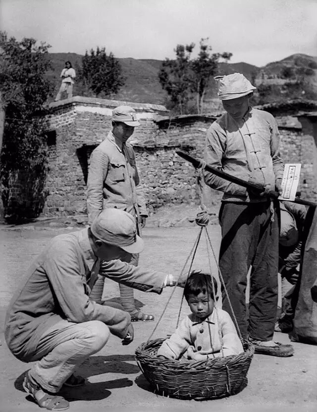 八路军战士给日本小女孩喂饭,右为聂荣臻司令员。