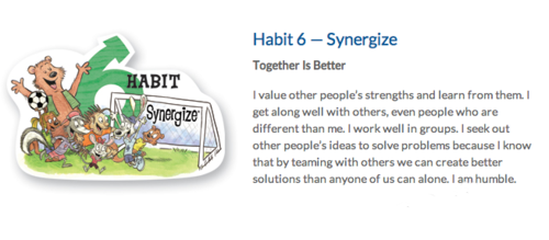I value other people's strengths and learn from them. I get along well with others, even people who are different than me. I work well in groups. I seek out other people's ideas to solve problems because I know that by teaming with others we can create better solutions than anyone of us can alone. I am humble.