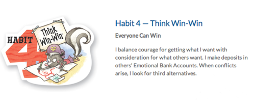 I balance courage for getting what I want with consideration for what others want. I make deposits in others' Emotional Bank Accounts. When conflicts arise, I look for third alternatives.