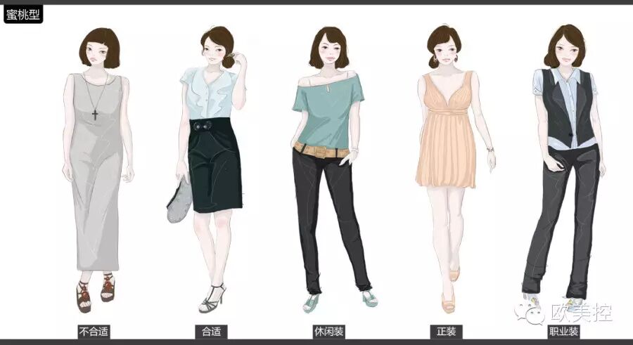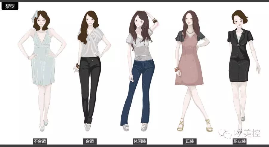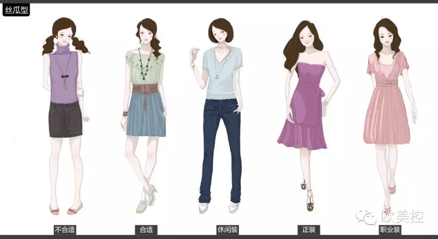 不可以穿的衣服:紧身喇叭裤(见图一中间),过膝裙,中分裤(见图三)。