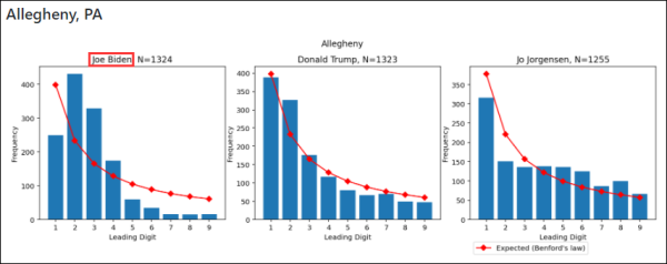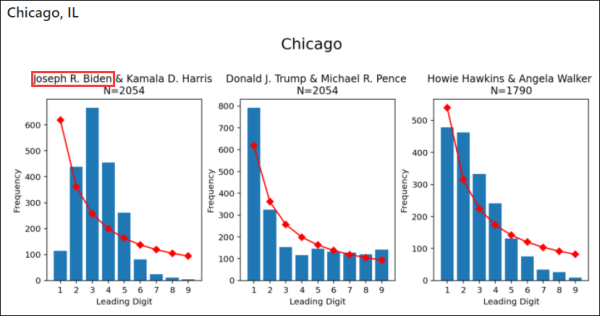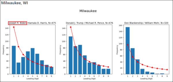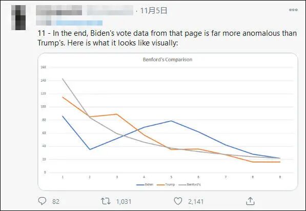 现在,本福特定律已经成为会计师们判断销售数据、财务报表等数据是否造假的依据之一,甚至还有人使用本福特定律来检验选举中是否存在舞弊现象。例如:本次美国大选中,有网友指出:拜登在包括威斯康星州密尔沃基、伊利诺伊州芝加哥和宾夕法尼亚州阿勒格尼的曲线均不满足“本福特定律”,而与此同时,特朗普在多个地区的曲线却又正好满足或基本满足该定律。