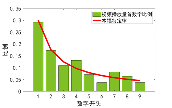 如果我们把视频播放量的首位数比例和本福特定律预言的比例放在一起,就会发现:视频播放量基本符合本福特定律。