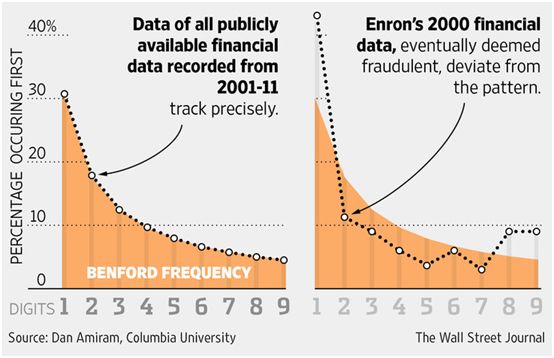 如果我们掌握了本福特定律,就可以利用这个定律发现财务数据造假,因为造假者人为篡改了数据,就会与本福特定律产生偏差。这里最典型的例子是安然公司。