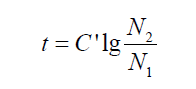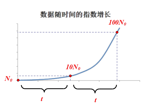 这是一个指数型函数,随着时间的推移,数据会指数长大。而且,指数型函数有一个特点:数据从N1增长到N2的时间与两个数据的比有关: