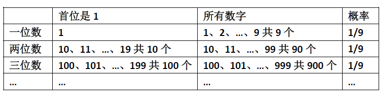 也许许多人会回答:1/9。因为首位可以是1、2、3、4、5、6、7、8、9,这些数字毫无规律,自然产生,所以首位是1的可能占1/9。或者你还会用一个表格印证自己的想法:在一位数、两位数、三位数…中,首位是1的数字都只有1/9。
