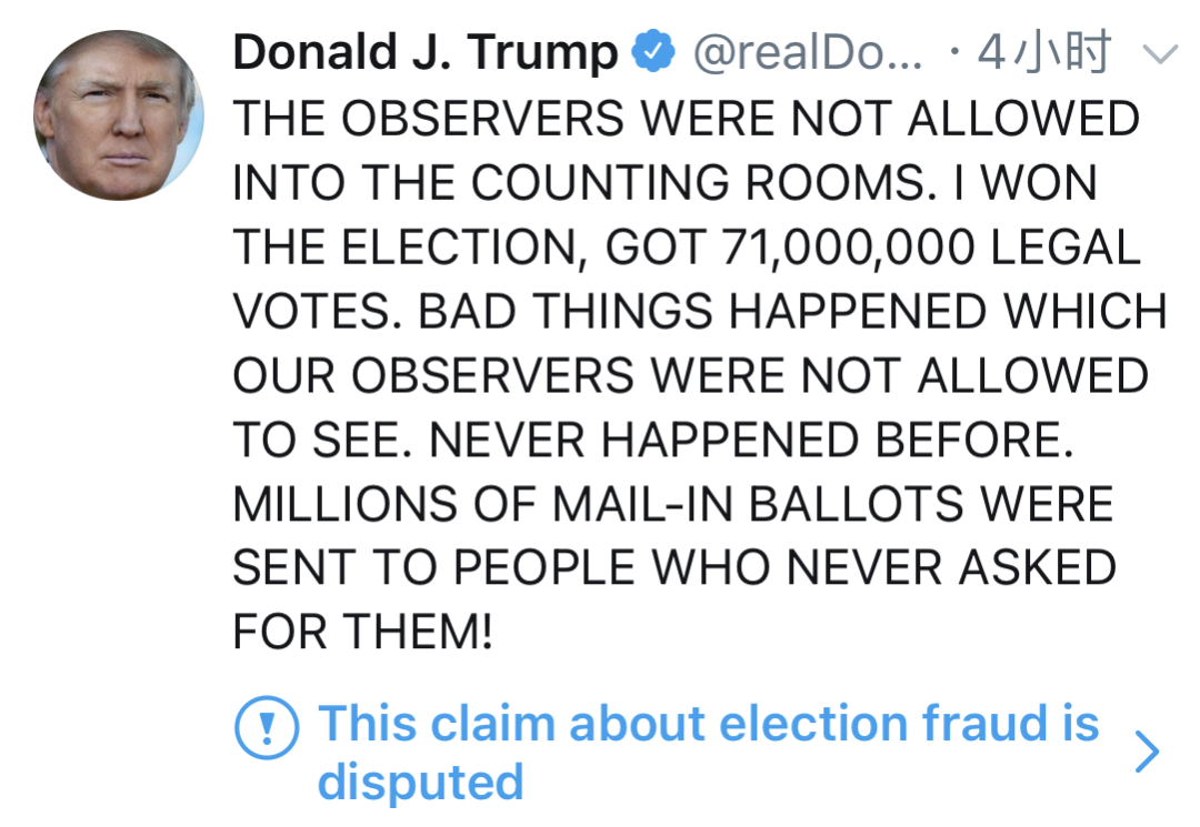 可是,貌似特朗普并不承认自己失败。他发推特指责选举公正性,并宣布自己赢得了选举。推特官方在特朗普的发言下标注:本条关于选举欺诈的声明是有争议的。