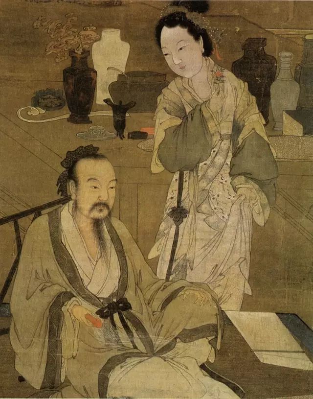 相传为宋代李嵩(浙江钱塘人)所绘。本图园中高木奇石,枝叶掩映翁郁,树下士人持拂闲坐于榻上,左腿盘起,聆听拨阮演乐并赏古玩。旁有仪态娇美仕女,焚香、拈花、持扇随侍。人物线条流畅,绘法近似明代画家杜蓳、唐寅。床面为藤编软屉,透气适合炎夏使用;床榻上置有直搭脑交椅式躺椅,没有腿足,供坐时后背依靠的调节式活动支架,一般适合在床上或席上使用。榻前方形香几有束腰、直腿、下为如意足、托泥。此方几造型与床榻成组用以承放香炉。