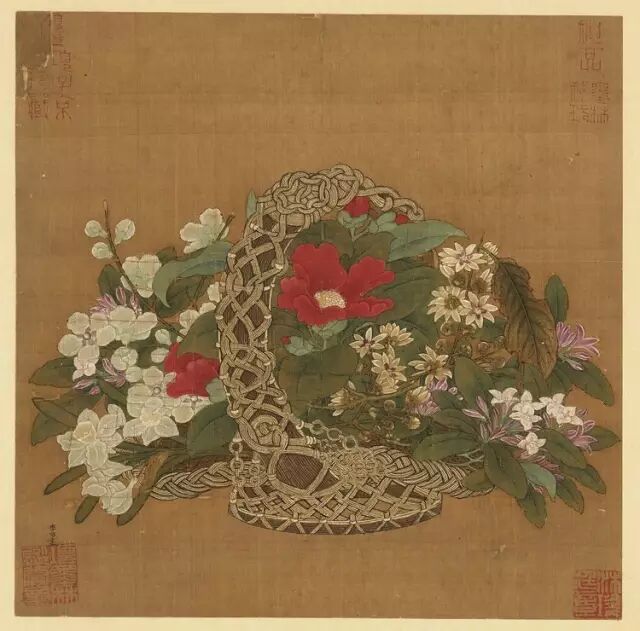 此图重设色,描绘盛开在精美的花篮中的鲜花。全图画风工整艳丽,为工笔重彩画中的佳作。画面左下方款署:“李嵩画”三字,其下方押“项子京家藏”半印。