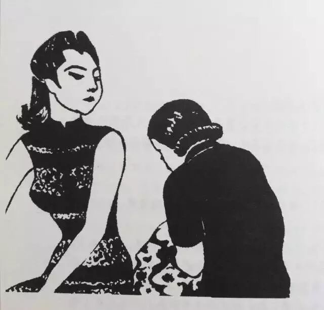 近年来最重要的变化是衣袖的废除。(那似乎是极其艰难危险的工作,小心翼翼地,费了二十年的工夫方才完全剪去。)同时衣领矮了,袍身短了,装饰性质的镶滚也免了,改用盘花钮扣来代替,不久连钮扣也被捐弃了,改用揿钮。总之,这笔帐完全是减法——所有的点缀品,无论有用没用,一概剔去。剩下的只有一件紧身背心,露出颈项、两臂与小腿。