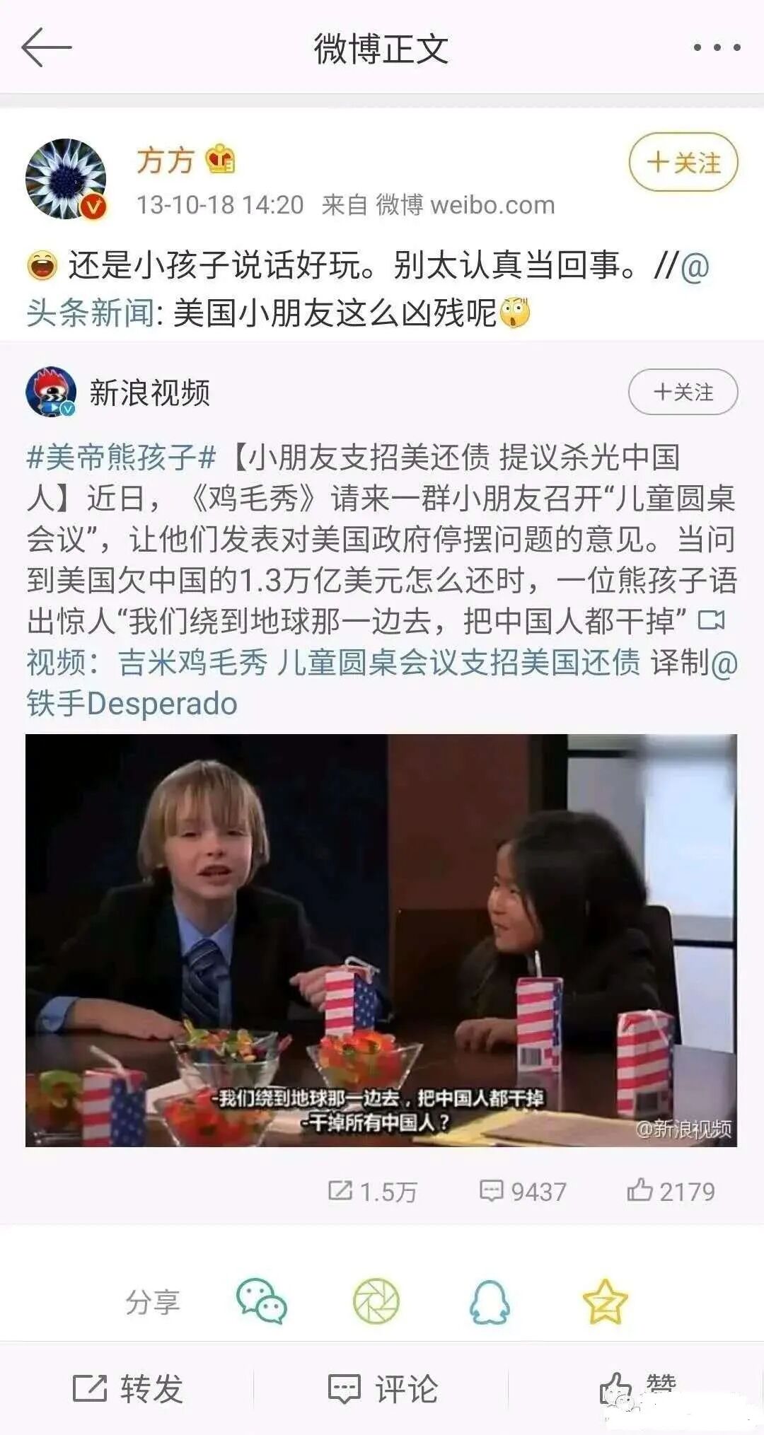 还有一种,就是抹黑中国,不承认中国抗击疫情取得成功。第一种操作空间实在有限,所以现在更多用的是第二种。美国、欧洲、日本,都有政客和媒体人指责中国的数据不真实,说中国实际上并没有控制住疫情。如果能够用舆论的力量让本国国民相信中国的抗疫并没有成功,西方的制度合理性危机也可以消弭大半,西方的制度神话还可以在疫情之后想办法修复。别看西方在政府责任方面存在争论吵架,但在维护西方制度合理性方面,西方国家内部的各派主流政治力量都能联合起来,资本会在背后统一协调政客和媒体的立场。美国是资本最大的寄居国家,西方是资本的中心地带,制度问题关系资本的身家性命,必须严防死守,不容有失。而方方日记对中国疫情的基本结论,无论是“只有结束,没有胜利”,还是还是“错,错,错”,以及对中国疫情的文学性描写“一城血泪”、“炼狱”,太符合美国等西方宣传机器的需要了,简直是想打瞌睡就有人送枕头。还有什么是比中国的文化“精英”贬低中国,可以让西方国家的人民更容易相信呢?方方日记有助于西方用来直接证明中国的体制不行,间接证明西方的体制还行。方方日记对中国疫情初期失误的夸大和突出(作者注:我们反对夸大失误并不是不要求追责),以及中国媒体一直把方方日记定性为真实的记录,方方日记很有可能会成为美国以后控告中国的锐器,被作为美国向中国索赔的重要证据。综上,方方日记至少在三方面满足了西方国家的政治需求,至少可以一鸡三吃。而且,方方日记中不含有任何对美国不利的信息和评价,对美国完全做到了绿色无害。即使美国政客和媒体多次用“武汉病毒”和“中国病毒”这样的词汇污名化武汉,污名化中国,方方都没有批评过美国一个字。方方日记中连一个对美国不利的标点符号都没有,可以放心大胆使用。方方不是这次才这样,而是一贯对美国如此。2013年,得知美国的小男孩对中国发出下面的仇恨声音时,看看方方多么大度,还带着掩饰不住的开心表情呢: