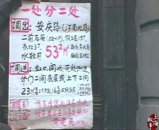 即便这样,住房困难依然是当时上海最大的生活难题,因而一部分上海居民也动起了换房的脑筋,他们在电线杆上或公交车站旁张贴小广告,在马路边、到公园里去碰运气,在房屋不能上市交易的计划经济时代,换房成了当时百姓解决住房困难、家庭矛盾和邻里纠纷的唯一途径。