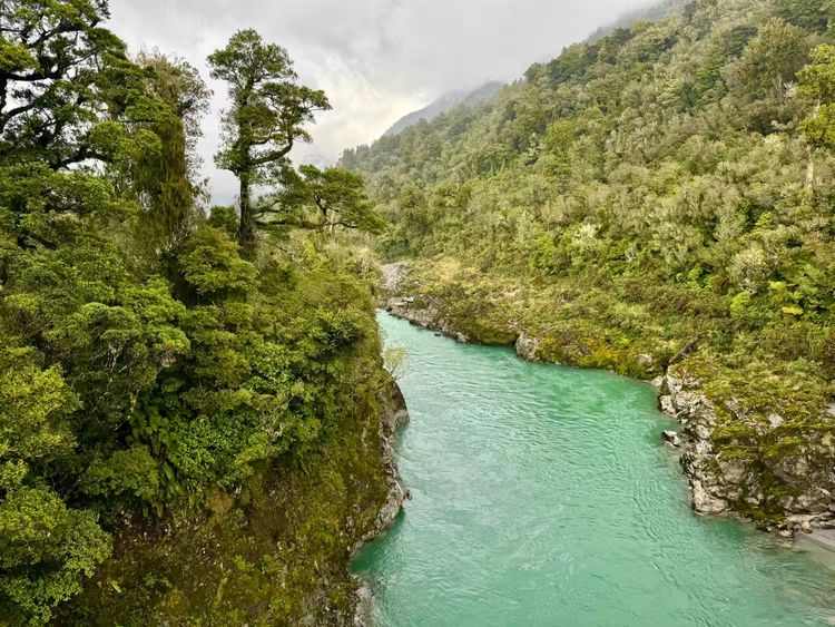接着我们又来到了这个叫霍基蒂卡峡谷的蓝湖(Hokitika Gorge)原本传说这里的水应该是梦幻的牛奶蓝,结果因为赶上阴天,看起来呈偏绿色,倒给人一种安静又清澈的感觉,也别有味道,就像大自然在低声细语,不用张扬,却足够迷人…