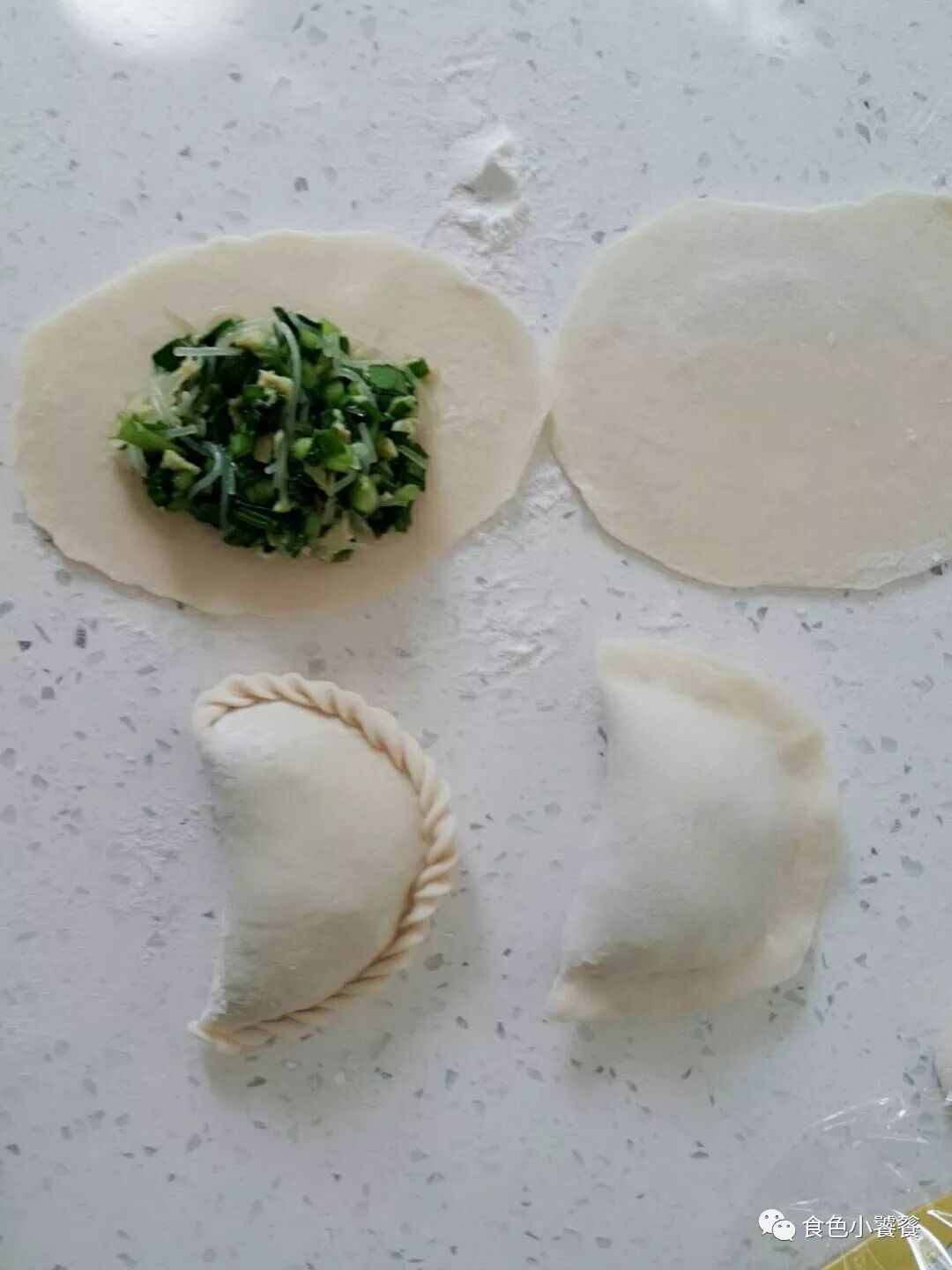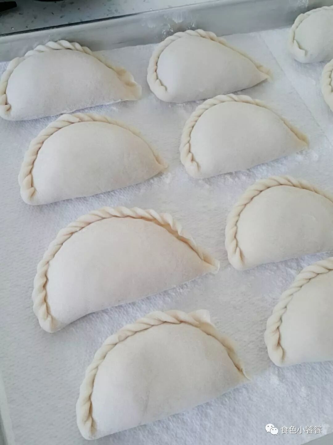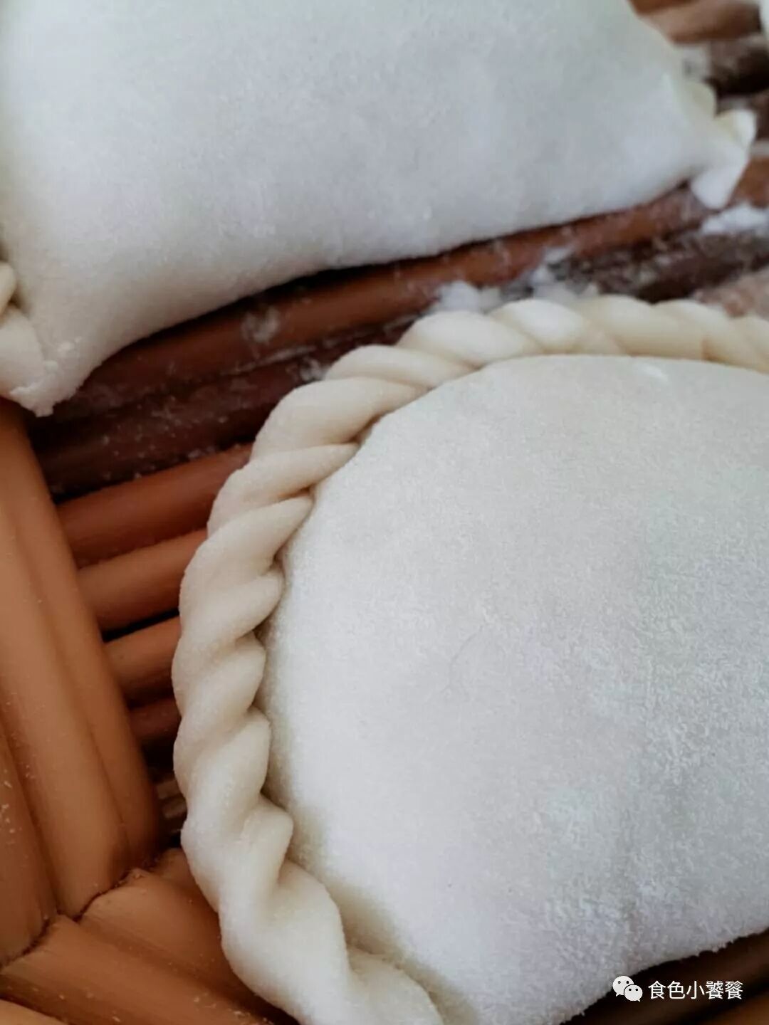 注意皮不要擀的太薄,大约是饺子皮的两倍大。包成半圆形。