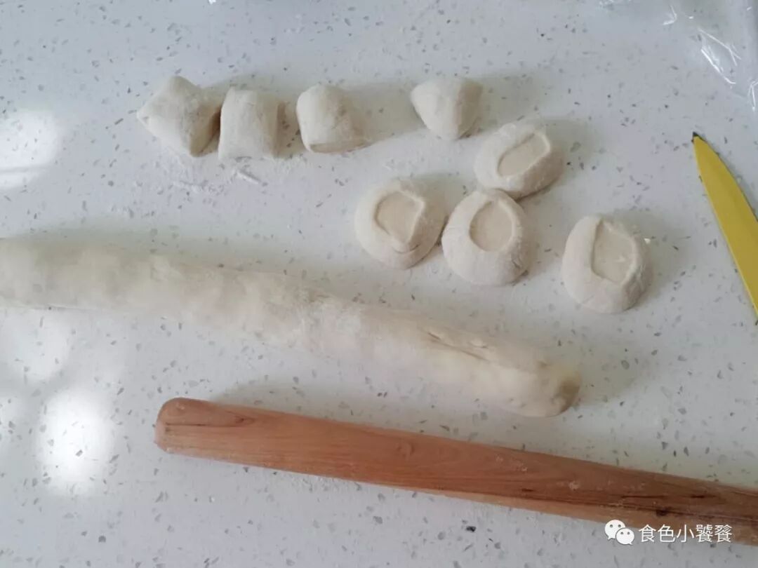 面团揉成长条,切成剂子。擀成圆形后再擀一下,变成椭圆形。