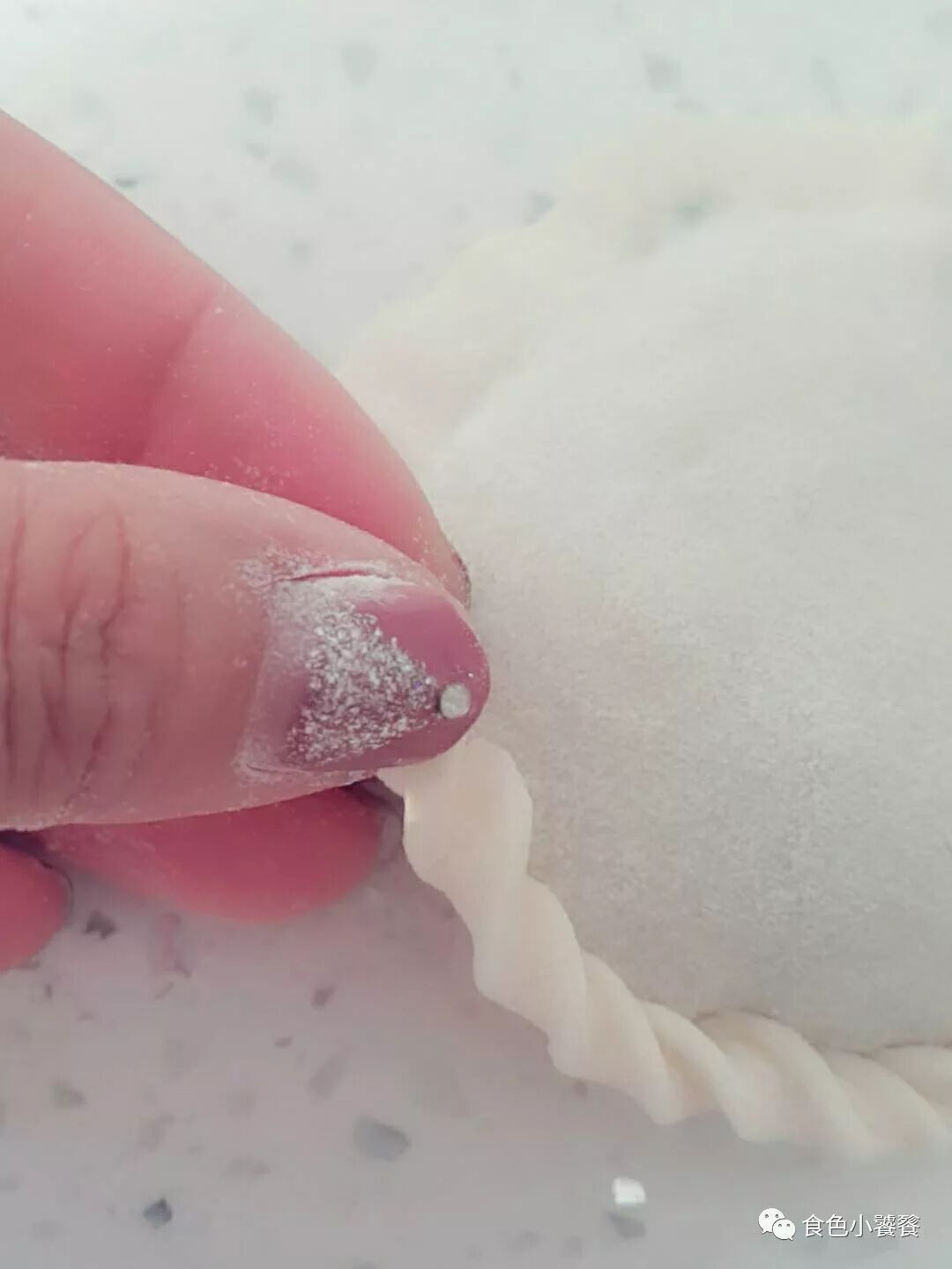 包的步骤如图,放入馅料,将边缘合拢,捏紧。然后顺着捏花边。