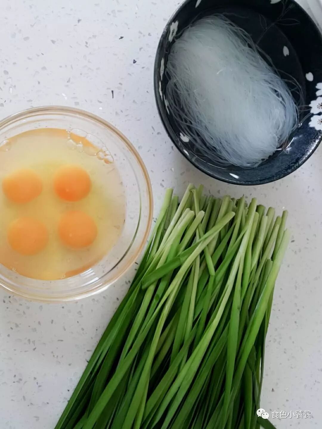 等待鸡蛋和粉丝冷却的时候,可以切韭菜了。洗净的韭菜切碎。
