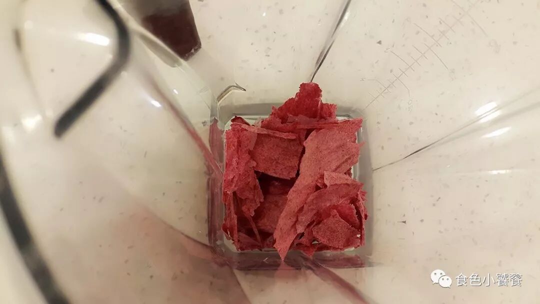 这一步可以使用咖啡磨豆机,但小饕个人经验VITAMIX效果更好。没有干杯也没关系,湿杯也可以少量打磨齑粉。将蔬果泥薄片撕成细碎的小块,根据打磨的粗细调整速度,直到全部打成极细的粉末。很多飞起粘在盖子上的,是最细腻好用的色粉。