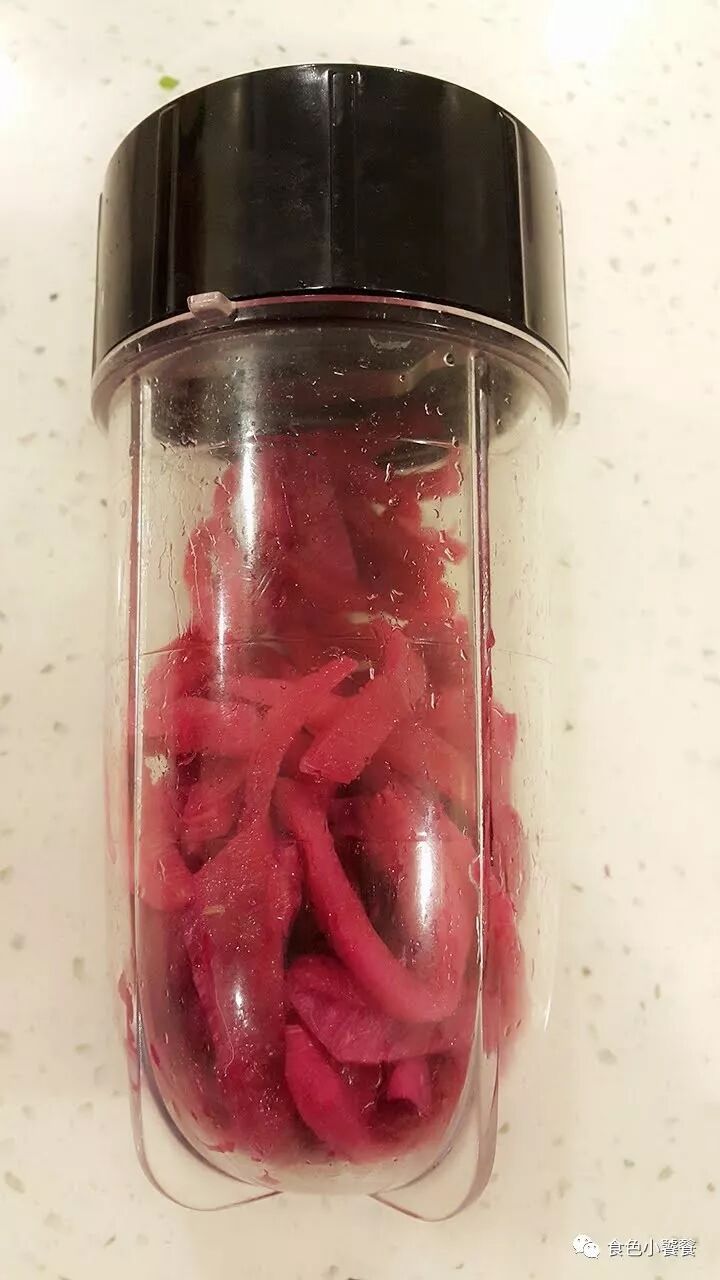 这里,火龙果皮就不需要烹饪了,直接切成小条,放入BULLET。