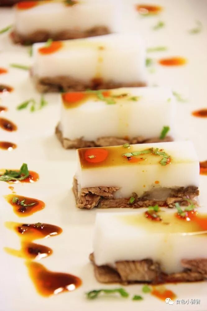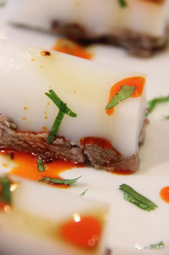 3. 在牛肉上浇上熬好的绿豆凉粉糊。待凉粉凝固了,取出切块装盘。