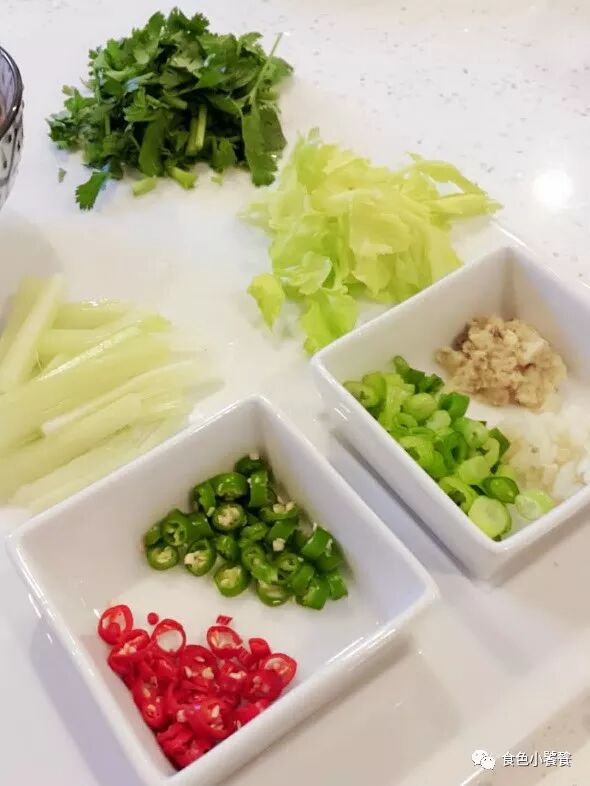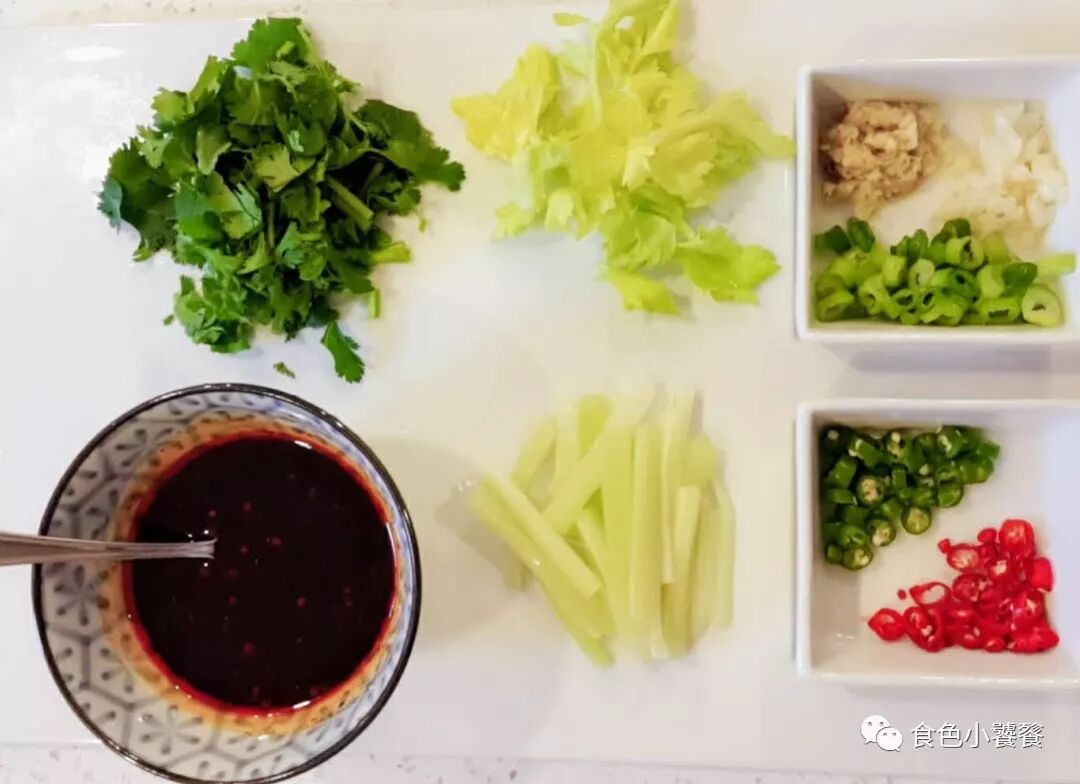 嫩芹菜梗(去筋切长条),干粉皮儿煮好待用。开水煮10分钟过冷。