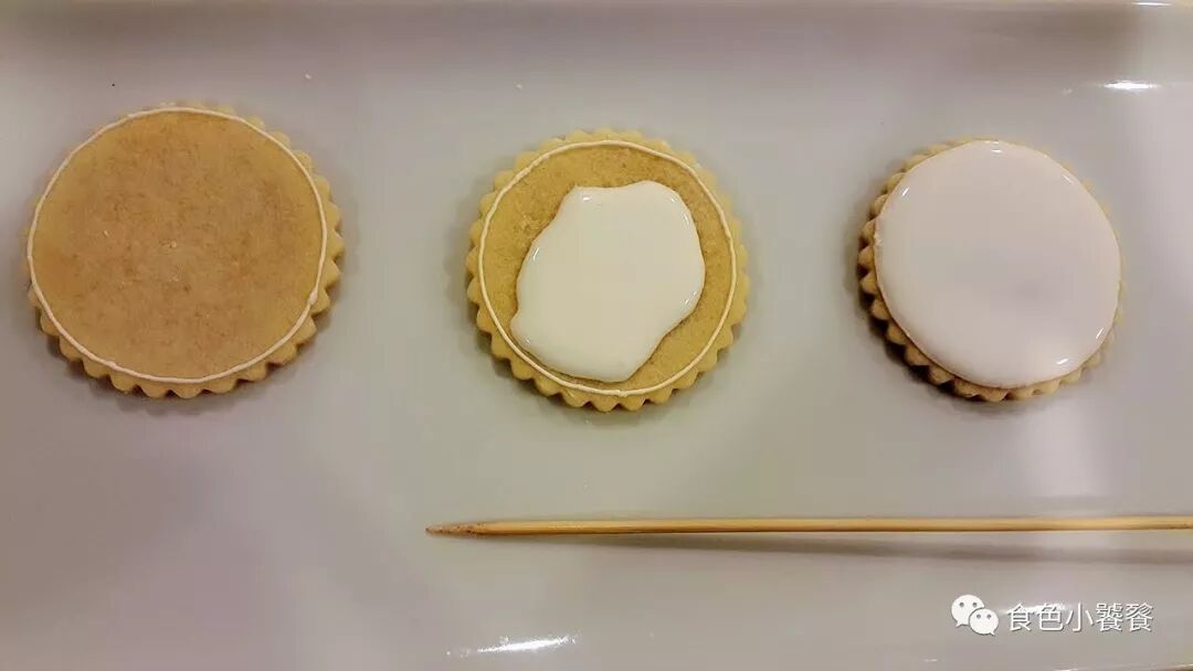 用装好勾边蛋白霜的挤花袋,沿着饼干的边缘画一条平滑的线条。这里有个窍门,请注意:要给饼干留一条窄窄的边,空出来。因为你将来移动饼干的时候,很容易把这个边给碰坏了,留出边不仅好看,也方便移动操作。